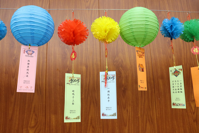 燈謎活動現(xiàn)場,燈籠和彩旗下懸掛著五顏六色百余個謎面,洋溢著濃濃的節(jié)日氣氛。燈謎內(nèi)容涉及冬奧會、傳統(tǒng)知識、生活常識、歇后語等方面,既具趣味性,又具知識性。