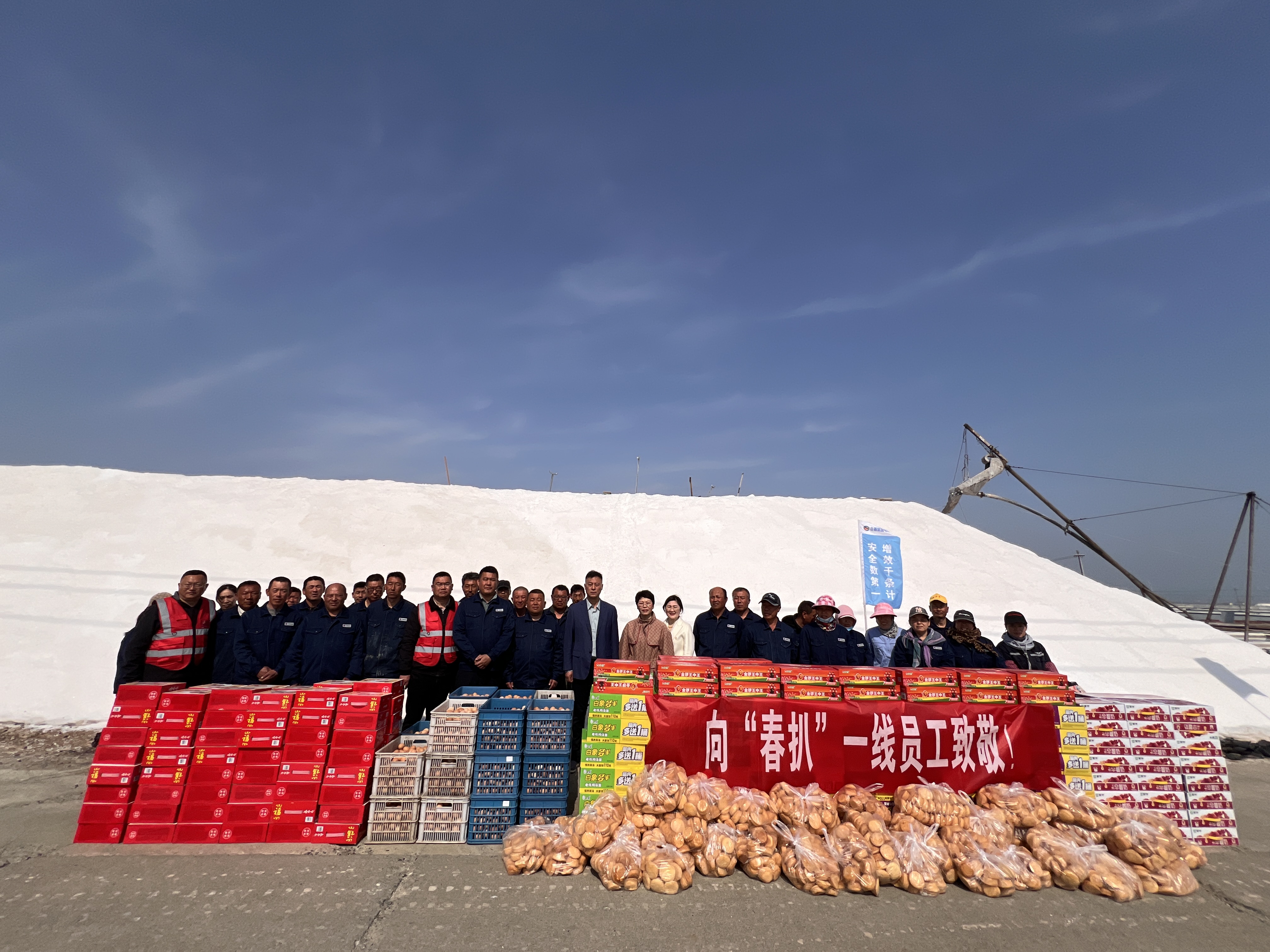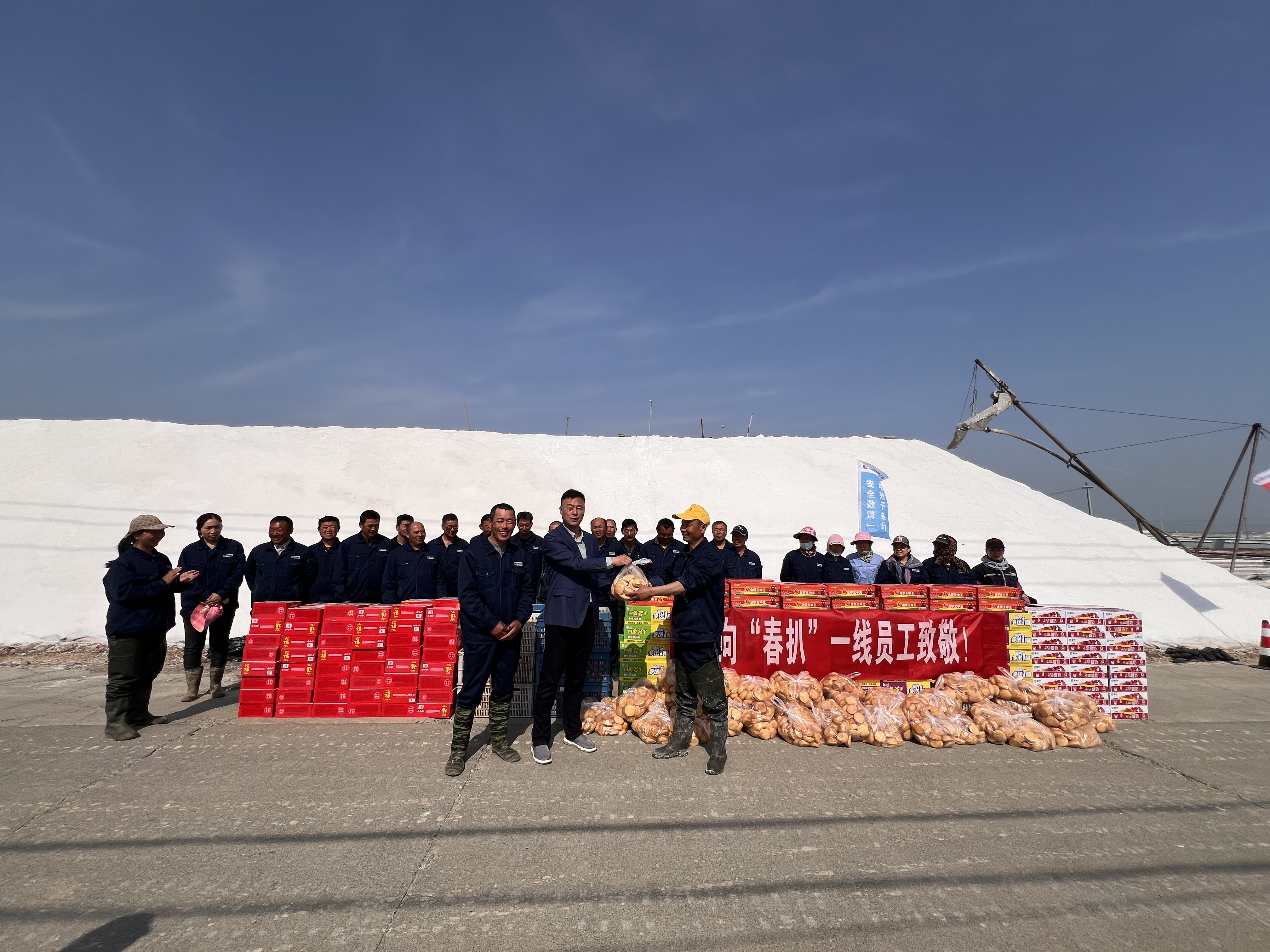 “你們辛苦了,我代表公司來看望大家。”在新河十班與埒南十一班,吳衛(wèi)平與扒鹽現(xiàn)場職工握手問好,感謝他們在過去的一年為日曬制鹽公司的原鹽生產所付出的辛勤努力,叮囑他們一定要落實落細扒鹽生產措施,增強責任感和警覺性,嚴格執(zhí)行各項規(guī)章制度,切實保障扒鹽期間的安全生產,并送上雞蛋、八寶粥、方便面、牛奶等物品。