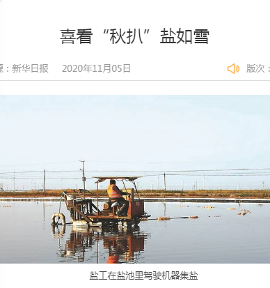 10月22日,在位于灌云縣東北角的灌西鹽場(chǎng),一名鹽工正開著電動(dòng)履帶扒鹽機(jī)在鹽池里扒鹽。這一天,鹽場(chǎng)人簡(jiǎn)稱“秋扒”的秋季扒鹽已近尾聲。不遠(yuǎn)處,7000噸鹽堆成的鹽廩像一座小雪山,那是鹽工們一星期的勞動(dòng)成果。