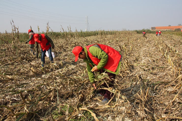 11月4日,灌西實業公司柴門居民點農田內出現了一批特殊的“農民”,他們身穿紅馬甲、頭戴小紅帽,正低頭彎腰的在農田里搜尋著散落的玉米。