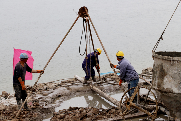 5月30日下午,藍色的天空沒有一絲云彩,火熱的太陽炙烤著大地。在灌西投資公司五灌河碼頭擴建項目建設工地,施工人員正在各司其職的工作著,有的在使用電鋸,有的在壓鋼筋,還有的在焊接鋼筋框架。遠處一臺混凝土澆灌機在進行混凝土澆灌作業,碼頭岸邊大小打樁機器一字排開,筆者親身感受五灌河碼頭二期工地開發建設的火熱場面。