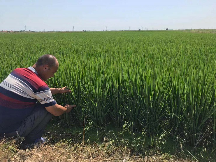 圖為二灣分公司靳國友正在查看自己管理的責(zé)任田水稻生長情況。
