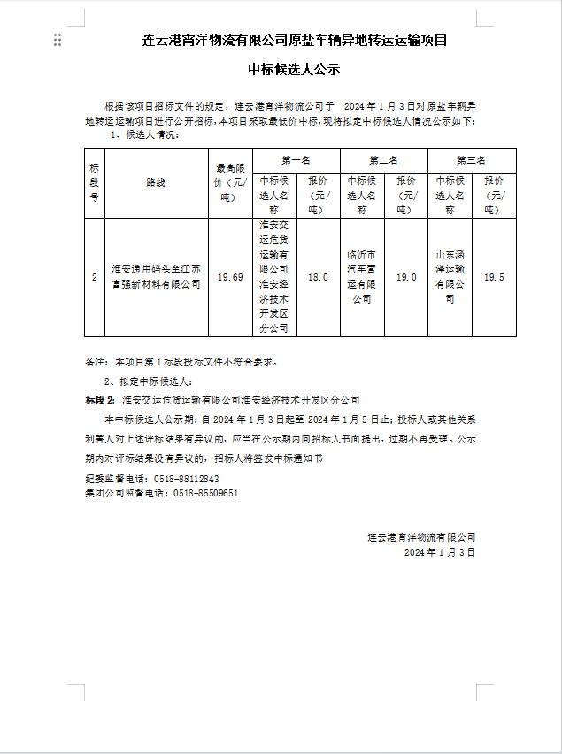 連云港宵洋物流有限公司原鹽車輛異地轉運運輸項目中標候選人公示