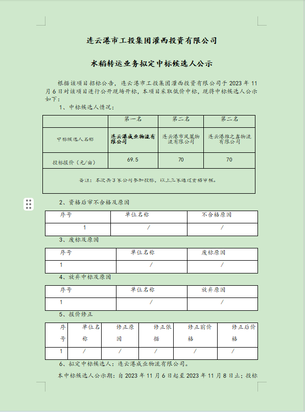 連云港市工投集團灌西投資有限公司水稻轉(zhuǎn)運業(yè)務擬定中標候選人公示