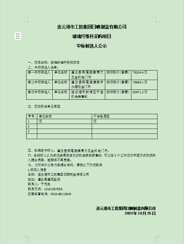 連云港市工投集團日曬制鹽有限公司玻璃纖維桿采購項目中標候選人公示
