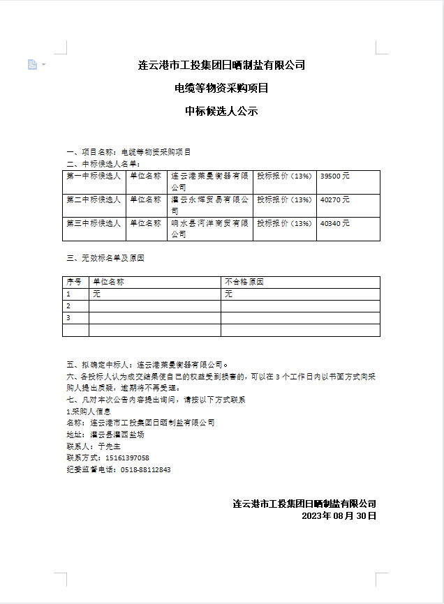 連云港市工投集團日曬制鹽有限公司電纜等物資采購項目中標候選人公示