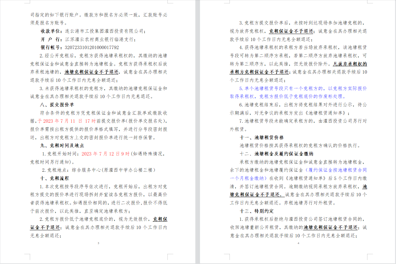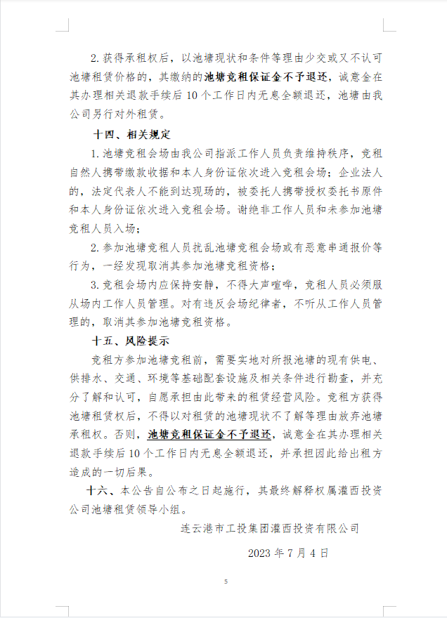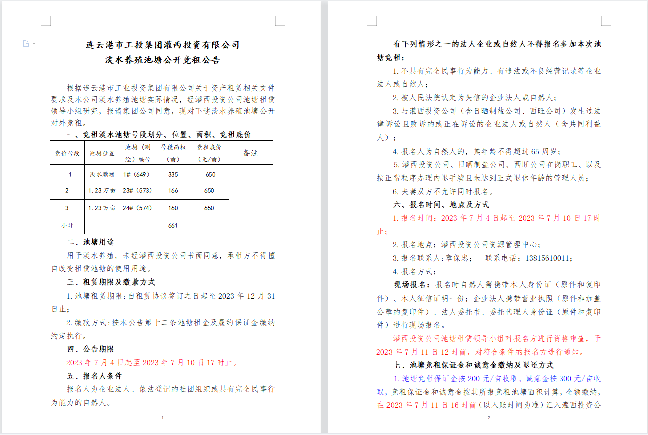 連云港市工投集團灌西投資有限公司淡水養殖池塘公開競租公告