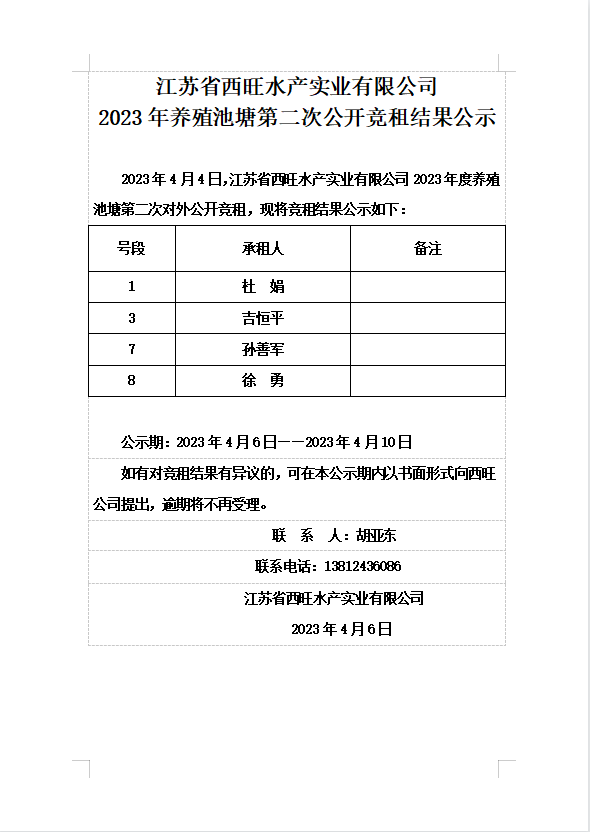 江蘇省西旺水產實業有限公司2023年養殖池塘第二次公開競租結果公示