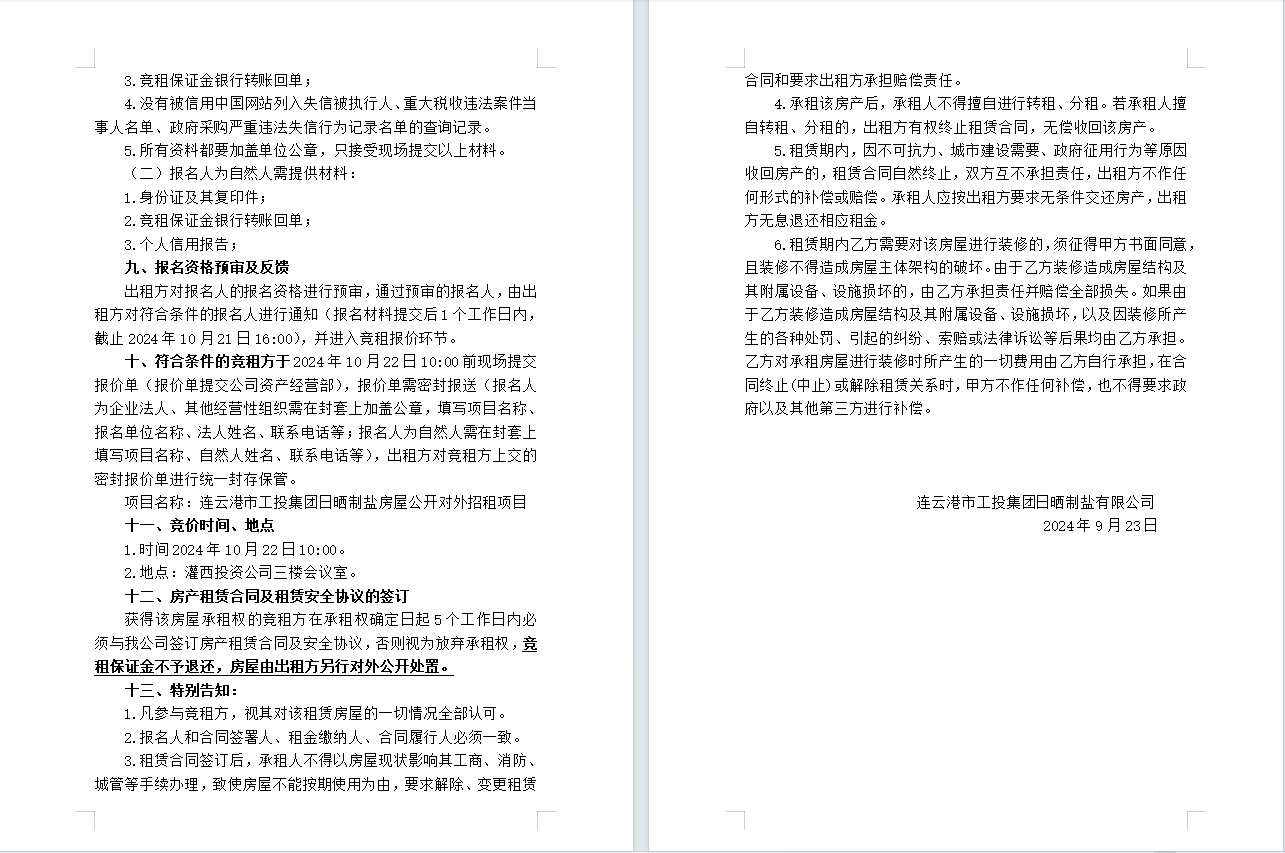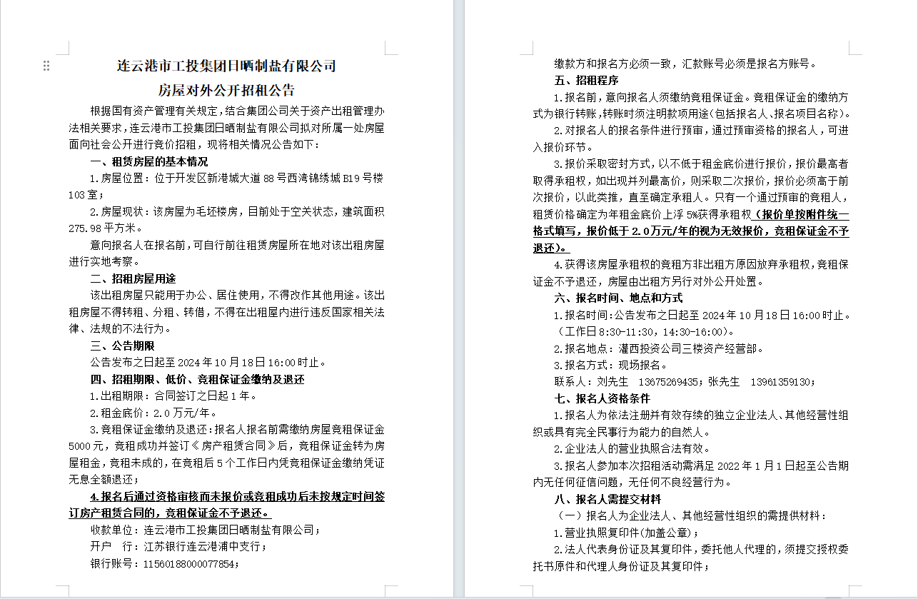 連云港市工投集團日曬制鹽有限公司 房屋對外公開招租公告
