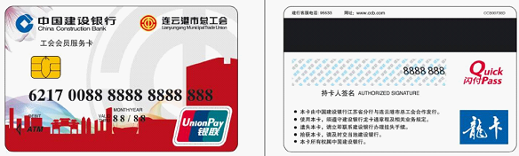下圖為工會會員服務卡卡樣,連云港市總工會發行的工會會員服務卡只此一種設計,請認準連云港市總工會logo和工會會員服務卡字樣,若同此圖不同均非工會會員服務卡。