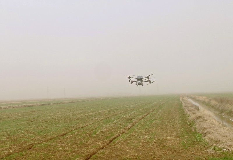 3月23日,大新農(nóng)場正在使用植保機開展小麥?zhǔn)┓首鳂I(yè)。