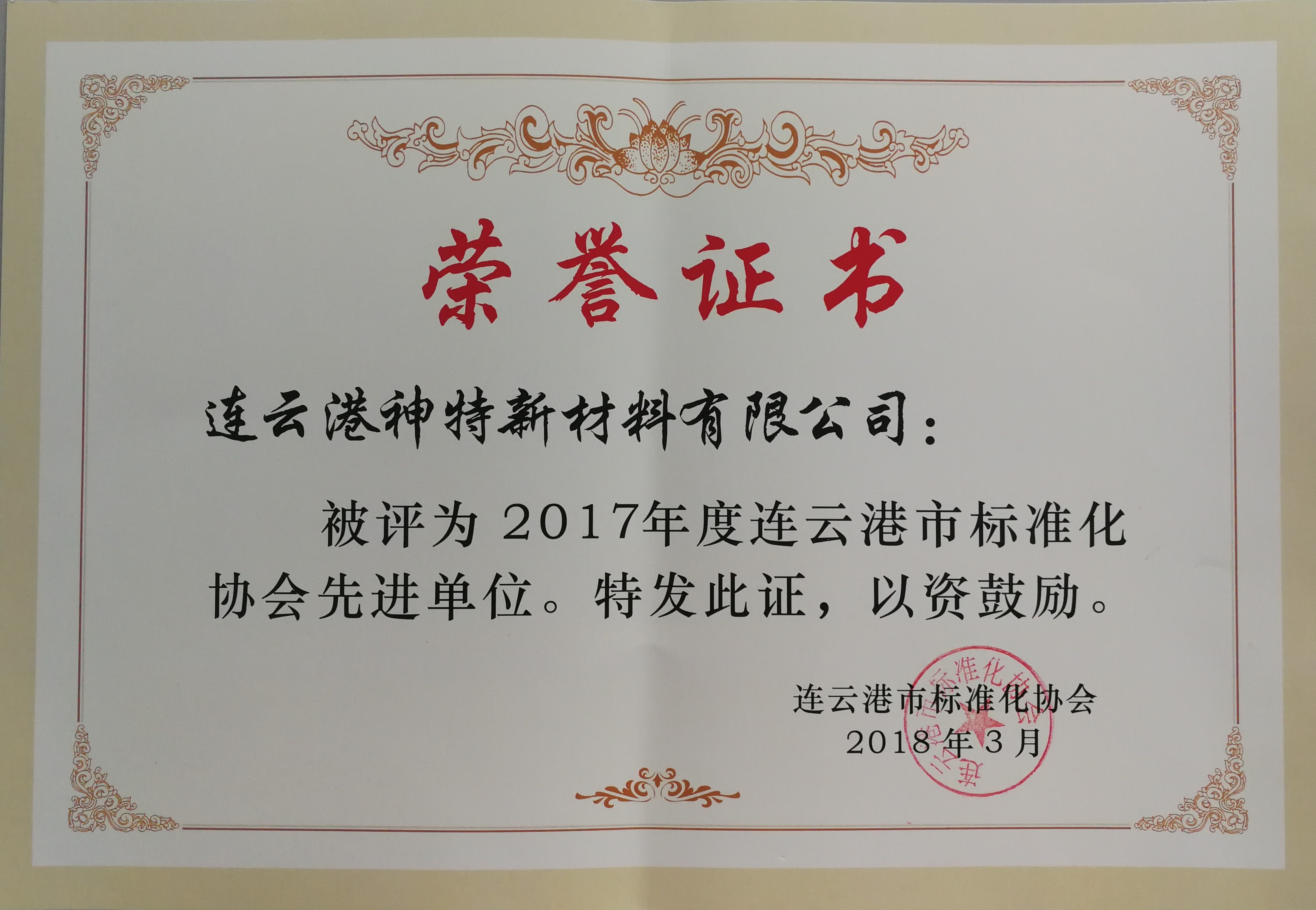 4月2日,神特公司參加由市標準化協會組織的2018年會員大會,被批準為連云港市標準化協會團體會員單位,并被評為2017年度連云港市標準化協會先進單位。