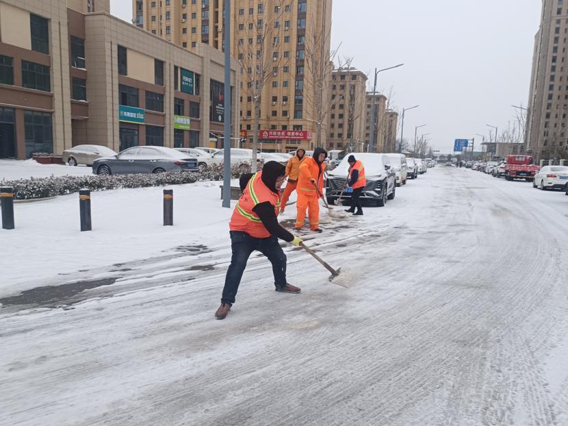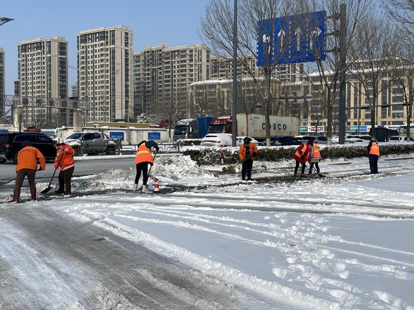 5日凌晨4點,該公司負責人于廣華已經在除雪的第一線,積極安排工作調度,對新光路、平山路、黃海大道等重要路段突擊清掃,大家頂著風雪,齊心協力,分工明確,高效配合,全力清除路面上的積雪和暗冰,及時為車輛和行人清理出一條條“安全路”。