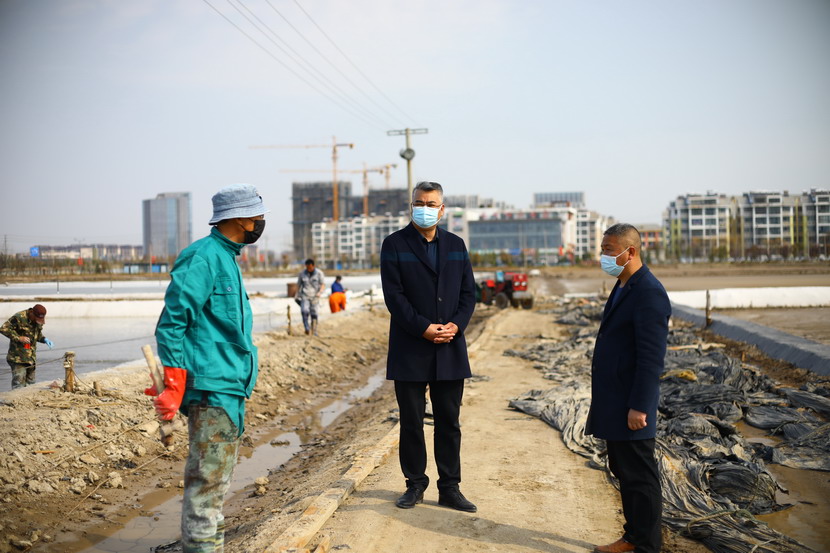 第一站來到海州灣公司昌圩班組。該班組4月1日礦鹵灌池,目前第四塊結(jié)晶池正在進(jìn)鹵,該公司三大組長帶著各自隊伍都來支援,一起給新灌結(jié)晶池更換新塑苫布,大家忙的不亦樂乎。王董事長首先慰問大家,新冠疫情暴發(fā)以來,海州灣公司廣大員工克服困難,一邊強化疫情防控,一邊加班加點抓生產(chǎn),雖然有的工作耽誤了,但是礦鹵灌池工作仍然趕在天時轉(zhuǎn)好之前進(jìn)行了。昨天進(jìn)鹵的結(jié)晶池底已經(jīng)鋪上了一層鹽,看起來甚是喜人。昌圩班組負(fù)責(zé)人,老先進(jìn)老黨員朱春年同志看到王董事長來檢查工作,他也非常高興,和海州灣公司負(fù)責(zé)人劉天義一同聚攏過來,與董事長攀談,匯報工作。最后王董事長強調(diào),一定要抓緊灌池,抓緊更換新塑苫布,打好“礦鹵復(fù)產(chǎn)”戰(zhàn),我們基礎(chǔ)產(chǎn)業(yè)牢固了,臺北的發(fā)展也就穩(wěn)固了。同時,也不要忘記抓好疫情防控工作,職工集體工作時要保持一米線距離,保證不扎堆。劉天義、朱春年代表職工表態(tài),一定按照投資公司有關(guān)布置抓好各方面工作,一定拼命干,加油干,爭當(dāng)虎將打頭陣,當(dāng)好“臺北保衛(wèi)戰(zhàn)”主攻隊。