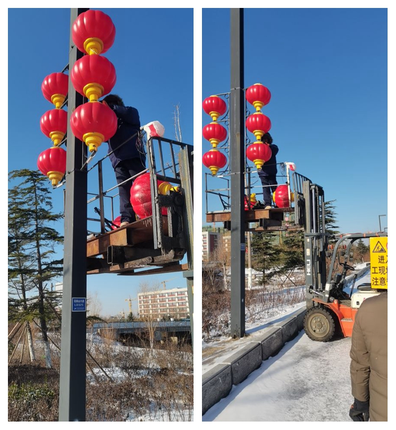 “亮華港城”。近期的一場大雪不僅給港城披上一件銀裝,也將花果山大道兩旁的路燈和燈籠刮落損壞。翔立鐵軍放棄休息奮戰在修復燈籠工程一線,保障了人民群眾的出行安全。