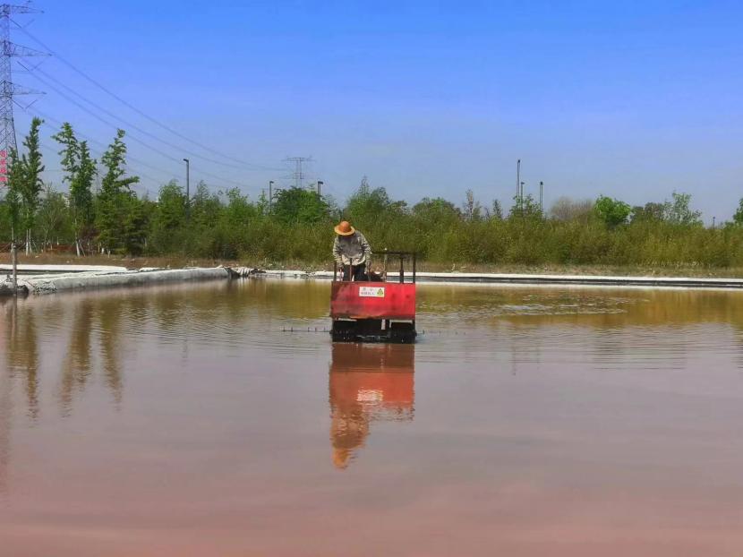 在原鹽生產中有一道重要的工序叫“活碴”,就是把結晶池中的鹽進行翻動,翻動后有利于鹽晶面生長,增加鹵水與鹽晶體的接觸面積,提高原鹽產量。每日清晨6點半,礦鹽班組準時有一名工人駕駛活碴機,對鹽池板進行破碎翻動,保持鹽層的疏松和顆粒間一定的間隙,確保晶體長得既快又好。