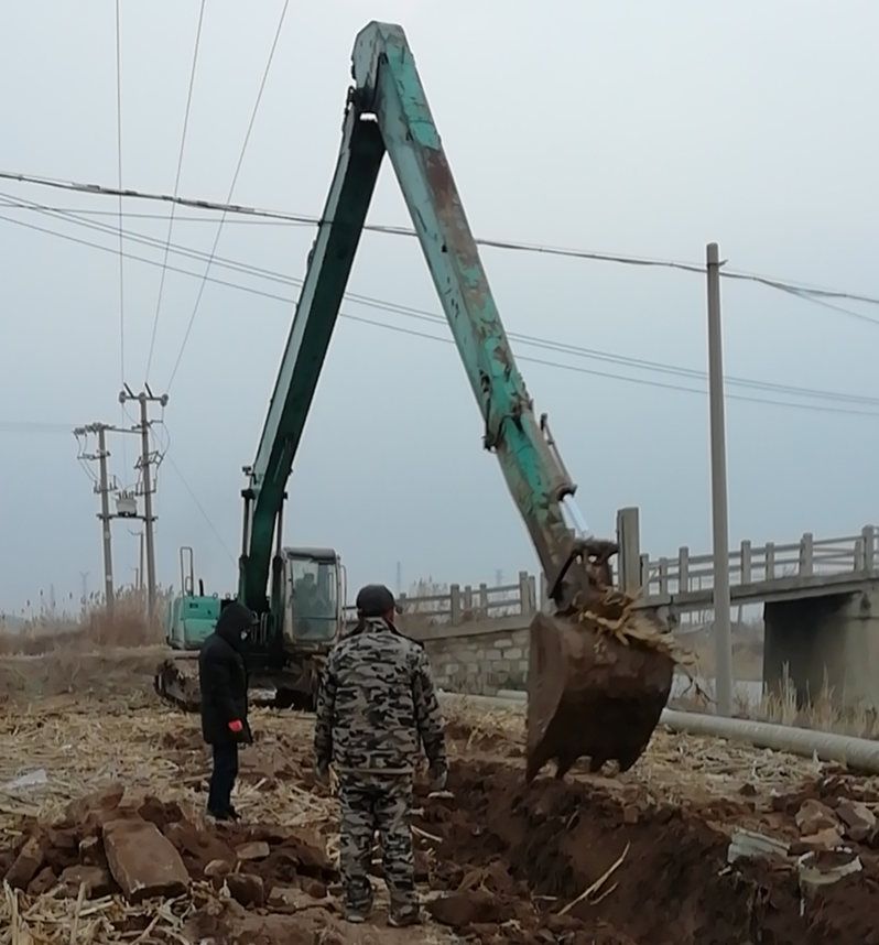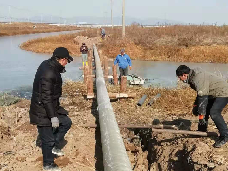 難!難!難!有困難才具有挑戰(zhàn),在“四拼”前一切困難皆為“紙老虎”,大家及時(shí)將壓力變?yōu)閯?dòng)力。確定方案后,立即分頭行動(dòng),一切工作按部就班,購(gòu)買(mǎi)8米木樁,河岸邊專(zhuān)人指揮長(zhǎng)臂挖掘機(jī)機(jī)械打樁,頭頂高壓線(xiàn)與通信線(xiàn)路相互交織,現(xiàn)場(chǎng)安全員全過(guò)程監(jiān)督指揮保障施工安全距離緊張施工,利用簡(jiǎn)易泡沫筏人工敲開(kāi)河面冰層,劃到河心鉆孔安裝木橫擔(dān),人工開(kāi)挖河對(duì)岸管道,切割吊取管道,打磨涂覆,一切都在有條不紊的進(jìn)行中。考慮到玻璃鋼管道的易碎性,不敢使用挖掘機(jī)吊裝,只能全人工小心翼翼的一小段一小段的輕抬慢放,慢慢挪到門(mén)型橫擔(dān)上緩緩過(guò)河,捆綁固定,最后是對(duì)口纏裹涂覆回填竣工。