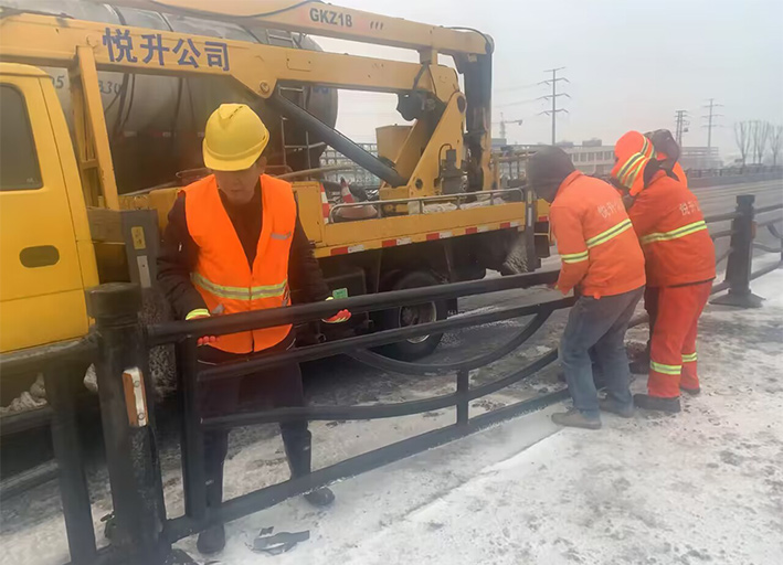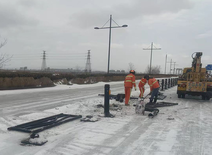 近兩日,因雨雪天氣,道路結(jié)冰濕滑,車輛行駛過(guò)程中發(fā)生意外,造成港前大道、海濱大道、228國(guó)道等地段發(fā)生多起道路護(hù)欄等設(shè)施損壞情況。收到信息后,市政分公司道路養(yǎng)護(hù)人員迅速反應(yīng),在班長(zhǎng)孫寬成帶領(lǐng)下,隊(duì)員們頂風(fēng)冒雪第一時(shí)間趕赴現(xiàn)場(chǎng)。