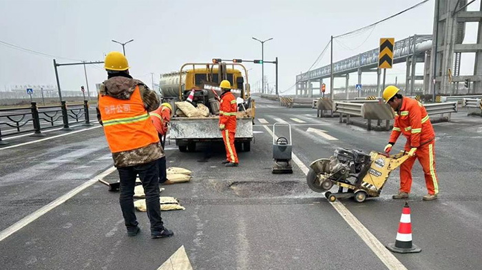 ? ? ? 連日來,為了保障新區道路平穩暢通,市政分公司組織專業力量,分組開展坑洞修補。市政維修人員加班加點先后對港前大道、徐新路、海濱大道、石化區陬山路等重點道路大小坑塘30余處破損部位進行修補。